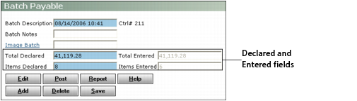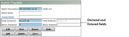 6 Add the payable and click Save. See “To create a payable batch” for detailed information about adding a payable.Repeat this process for each payable you are adding. Voyager presents a new Payable screen until the total amount of the payables entered matches or exceeds the total declared, or the number of payables entered matches the items declared. Then the Batch Payable screen appears. This screen displays the total amount and number of items declared and entered.