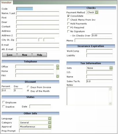 Name Voyager provides two fields for the name. It combines these two fields to form the payee on checks, the first line on vendor mailing labels, and the name on vendor reports.