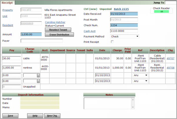 Charges you enter from the Receipt screen are not posted in a batch. They post directly to the G/L. Once posted, you can review the charges, but you cannot edit them.This procedure assumes you are viewing a Receipt with the Payer field completed, but that has not been saved. See “To create a detail receipt batch” for information about creating a receipt.