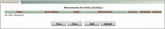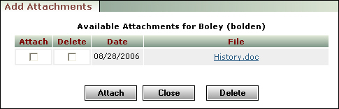 Adding an Attachment Use this procedure to add the following types of files as attachments: l Previously uploaded files that are no longer attached to another record. l Files uploaded with Document Manager that are not already attached and are not in a closed batch. For information about Document Manager, see Chapter 13, “Document Manager.” To add an attachment 1 Open the record to which you want to add an attachment. 2 Click Attachment in the Data or Functions menu. The Attachments screen appears. 3 Click Add. The Add Attachments screen appears, displaying attachments available for the record. 4 Select the Attach check box for each file you want to attach to the record. 5 Click Attach. 6 Click Close. The screen closes and the added attachments appear in the Attachments screen. 7 If appropriate, make changes to the Type and Description fields, and the Secure and Weblinks check boxes. 8 Click Save.