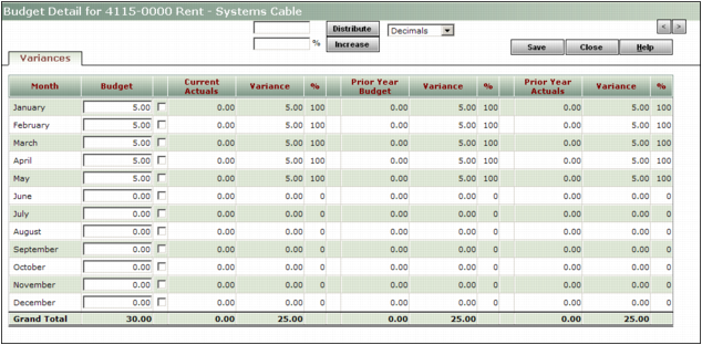 n If there are amounts in the Budget column already, you can increase them by a percentage by entering an amount in the Increase field and clicking Increase. For example, if the amount is $1,000 and you enter 5, the new amount will be $1,050.