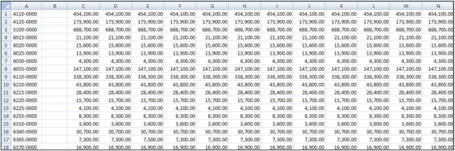 The number format must match the G/L account number format specified on the Essential Accts tab of the Accounts and Options screen. For example, if if the Voyager format is ????-????, account numbers must look like 1000-1100 rather than 10001100.Column B Leave empty.Columns C--N Enter budget data for regular accounts for each of the twelve months, with January in Column C, February in Column D, and so on.