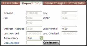 If there is a date in the Last Credited date field on the Deposit Info tab of the Resident screen, Voyager calculates deposit interest from that date forward. If there is no date in the Last Credited date field, Voyager calculates deposit interest from the time that you received the deposit, even if you did not start using this system until later.