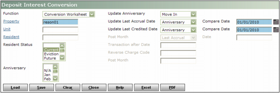 1 Property Type or select a code for a property or property list.Unit Type or select a unit code.Resident Type or select a resident code.Resident Status Select a resident status.Anniversary Select the month of the anniversary date. Voyager compares this date with the date in the Anniversary field on the Deposit Info tab on the Resident screen.Post Month Select how Voyager sets the post month for deposit-interest transactions created by conversion.Last Accrual Voyager uses the date from the Last Accrual Date field on the Deposit Interest Conversion worksheet.Specify Date If you select this option, type the post month in the Date field.