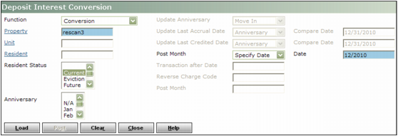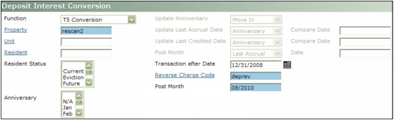 Property Type or select a code for a property or property list.Unit Type or select a unit code.Resident Type or select a resident code.Resident Status Select a resident status.Anniversary Select the month in the Anniversary field on the Deposit Info tab on the Resident screen for the records you want to convert.Transaction After Date Type or select the date deposit interest was last credited that Voyager should include in the conversion.Reverse Charge Code Type or select the charge code for deposit reversals.Post Month Type the month in which you want Voyager to post the transactions.