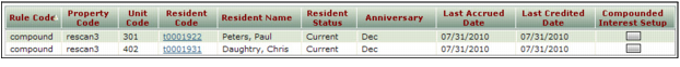 2 Property Type or select a code for a property or property list.Unit Type or select a unit code.Resident Type or select a resident code.Resident Status Select a resident status.Anniversary If the Simple Deposit Interest method was previously used and you want to convert the deposit interest record based on the Anniversary field on the Deposit Info tab on the Resident screen, select the month.Update Anniversary Select how Voyager will determine which month to put in the Anniversary field on the Deposit Info tab of the Resident screen.Move-In -1 The date in the Move In field on the Lease Info tab on the Resident screen, less one month. For example, if the move-in date is March, the Anniversary field is updated to February.Update Last Accrual Date Select how Voyager updates the date when deposit interest was last accrued. This is the date up to which the previous system already calculated the deposit interest. Voyager calculates interest as of this date.Anniversary Voyager uses the date from the Anniversary field as the last accrued date. If you select this option, you must also complete the Compare Date field