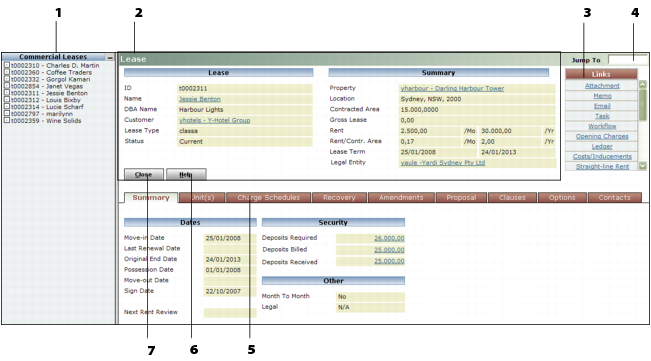 Data Screens 1 Navigation List Links to additional records that match the filter criteria. 2 Main part of screen The (first) record that matches the filter criteria. 3 Links/Functions/Data/Reports Menu Links to other screens for entering and viewing information associated with the active record. 4 Jump To Finds another record of the same type when you enter the code for the record and press TAB. 5 Tab Another part of the active record. 6 Help button Opens online Help. 7 Command buttons Performs the task that matches the name of the button (Save, Close, New).