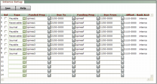 The Interco Setup table determines the funding/funded relationships between entities. Each parent can have multiple children, but each child can have only one parent.