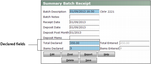 3 If necessary, adjust the Declared fields to allow for the receipt you are about to delete.