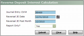 If you do not know the batch number, you can generate a Deposit Interest Liability Detail report. From the side menu, select Residential > Deposit Interest > Reports > Deposit Interest Liability Detail Report. For more information, see “Deposit Interest Reports”.Reversal JE Date Type the date for the journal-entry reversal.Reversal JE Post Month Type the post month for the journal-entry reversal.Report Only If you want to review the report prior to reversing the journal entry, select Yes. If you want reverse the journal entry, select No.