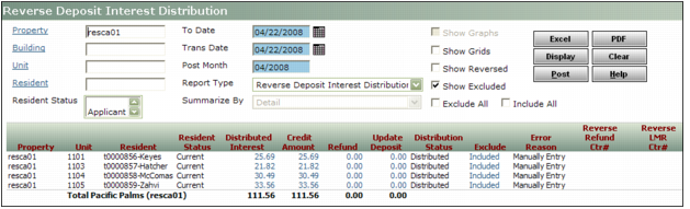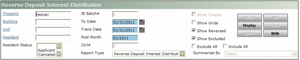 1 From the side menu, select Setup > Deposit Interest > Utilities > Reverse Deposit Interest Distribution. The Reverse Deposit Interest Distribution screen appears.Property Type or select a code for one or more property or property lists.Building Type or select a code for one or more buildings.Unit Type or select a code for one or more units.Resident Type or select a code for a resident.Resident Status Select one or more resident statuses.To Date Type or select the last day of the calculation period.Trans Date Type the transaction date for the reversal.Post Month Type the month to post the transactions.Show Reversed If you want Voyager to display reversed transactions, select this check box.Show Excluded If you want Voyager to display excluded transactions, select this check box.