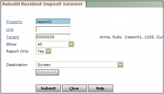 1 From the side menu, select Setup > Deposit Interest > Utilities > Rebuild Tenant Deposit Interest. The Rebuild Resident Deposit Interest filter appears.Property Type or select a code for one or more properties or property lists.Unit Type or select a code for one or more units.Tenant Type or select a code for one or more residents.Show Select which residents you want Voyager to include in the rebuild function.All Voyager includes all residentsOnly Difference Voyager includes residents where the actual amount differs from the amount displayed on the Deposit Info tab on the Resident screen.Report Only If you want Voyager to display the report without rebuilding the deposit interest, select Yes. If you want Voyager to display the report and to rebuild the deposit interest, select No.