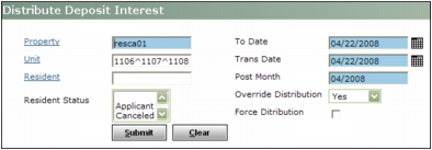 1 From the side menu, select Residential > Deposit Interest > Distribute Deposit Interest. The Distribute Deposit Interest screen appears.Property Type or select a code for one or more property or property lists.Unit Type or select a code for one or more units.Resident Type or select a code for a resident.Resident Status Select one or more resident statuses.To Date Type or select the date from the To Date field that was used for the deposit interest calculation.Trans Date Type the date you want the transactions posted.Post Month Type the month you want the transactions posted.