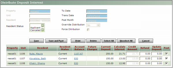 6 For each resident who should receive a deposit-interest distribution, select the corresponding Post check box for each resident who should receive a deposit distribution.