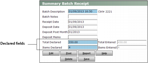 3 If necessary, adjust the Declared fields to include the receipt you are about to edit.
