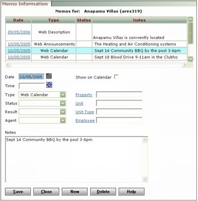 Editing a Memo To edit a memo 1 In the Data or Functions menu of the record associated with the memo you want to edit, click Memo. The Memo Information screen appears. The top part of the screen includes a table showing existing memos. 2 In the top part of the screen, click the link in the Date field for the memo you want to edit. 3 Make the desired changes. 4 Click Save. 5 Click Close.