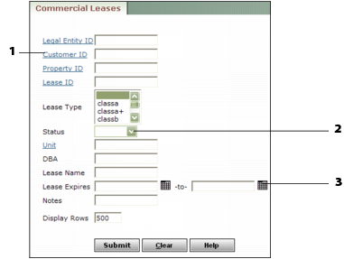 c Enter criteria to narrow the range of records that Voyager finds. For example, to find lease records for just one property, enter the code for that property in the Property field of the Commercial Leases filter. You can narrow the range further by using multiple criteria. For example, if you want to find current leases for a property, complete both the Property and Status fields.