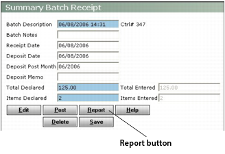 The batch screens for payables, receivables, charges, and journal entries include a Report button. You must generate a batch report before you can post a batch.
