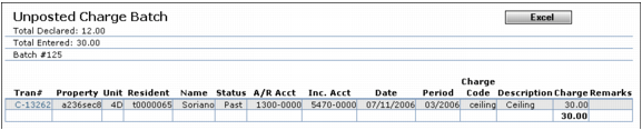 Click Report. The Unposted Charge Batch report appears. At the left side of the report, the Tran# column provides a link to each charge in the batch.