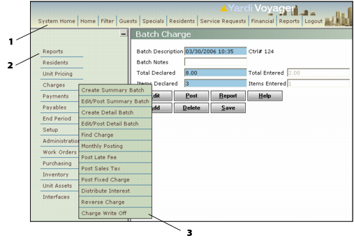 Returns you to the home page associated with your logon. For example, if you entered the Voyager Commercial user interface through the Commercial Property Manager Dashboard, this link returns you to that dashboard. Opens the filter associated with a the data screen that appears in the main part of the screen. For example, if you are viewing the Customer screen and want to view a record for a different customer, click Filter to access the Customer filter. For information about filters, see “Filters”. The side menu provides access to submenus from which you choose the Voyager screen that you want to work with. The instruction “From the side menu, select Charges > Review Charge” means to click Charges in the side menu and then click Review Charge in the submenu.