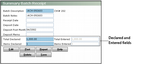 2 The Declared and Entered fields must match before you can proceed. If they do not match, you must modify the amounts in the Declared fields or edit the batch.