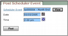 2 In the Scheduler Event field, type or select the name of the event.Scheduler Event Type or select the name of the event. Once an event has been specified, you can click the View button to configure the way Voyager handles the event.Date Type or select a posting date.Time Type or select a posting time.