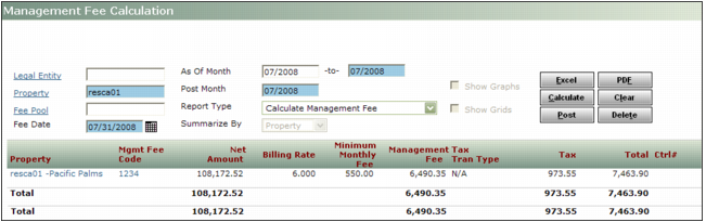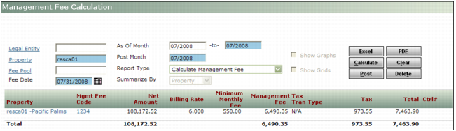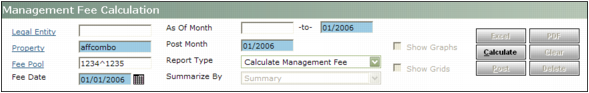 If you leave the Management Fee Calculation screen without posting, the calculation is saved. When you return to the Management Fee Calculation screen, you cannot calculate management fees for the same period. To review the management fees, you must select the Report Type: Unposted Management Fee Summary or Unposted Management Fee Detail.