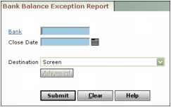 1 From the side menu, select G/L > Bank Functions > Bank Rec Exception Report. The Bank Balance Exception Report filter appears.Bank Type or select the bank account code.Close Date Type or select the ending date of the period.