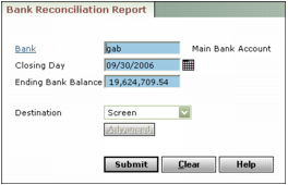 1 From the side menu, select G/L > Bank Functions > Bank Rec In Progress Report. The Bank Reconciliation Report filter appears.Bank Type or select the bank account code.Closing Day Type or select the ending date of the period.Ending Bank Balance Type the ending bank statement balance.