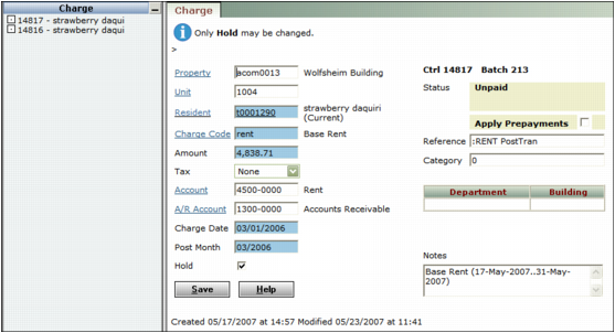Use the Charge filter to locate charges from posted batches and individual charges entered offline. If the charge is unpaid, you can cancel the hold status and apply prepays. For more information about prepays, see