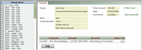 Review the information about the check for accuracy. The designation (Reconciled) appears to the right of the post month if the transaction has been reconciled. If a check is not reconciled, you can void it.
