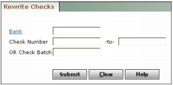 If you are using Voyager Construction and Job Costing, select Payable (JC) > Checks > Rewrite Checks.Bank Enter the bank account you used to write the original check.Check Number Type the range of check numbers you want to rewrite.OR Check Batch Type the batch number for the checks you want to rewrite.