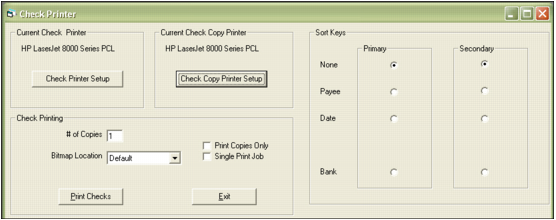 4 Review the printer settings and click Print Checks. The printer prints the checks and Voyager displays a confirmation message.