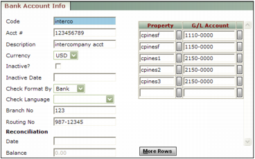 You must associate the property record for the funding entity with the property records for the funded entities in the record for the bank account used for intercompany transactions. As shown in the following table, the funding entity must appear at least twice in the Property list, while each funded entity must appear only once. You can use the same bank account for multiple funding/funded relationships by using different cash, due-to, and due-from G/L accounts.