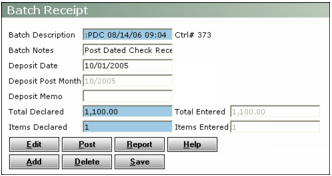 1 Delete the receipt batch created by applying the postdated cheques. The Batch Description begins with :PDC. Make a note of the control number of the batch. See “Deleting a Receipt Batch”.