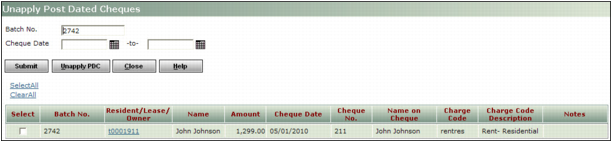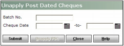 2 From the side menu, select Receivable > Postdated Cheques > Unapply Posted Dated Cheques. The Unapply Post Dated Cheques screen appears.Batch No. Type the control number of the batch you deletedCheque Date Type or select the earliest and latest dates for the cheques in the deleted batch.