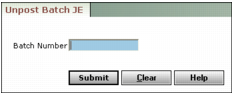 Unposting Journal Entry Batches When you unpost a journal entry batch, Voyager deletes the journal entries that were in the batch you unposted, and creates a new batch with the same journal entries with new control numbers. The new batch has the same name as the unposted batch, but preceded with a tilde (~). This feature is not available in Voyager Construction and Job Costing. To unpost a journal entry batch 1 From the side menu, select G/L > Unpost Batch JE. The Unpost Batch JE filter appears. 2 Type the batch number of the batch you want to unpost. 3 Click Submit. Voyager unposts the journal entries that were in the batch number you entered. A message displays the new batch number and the number of journal entries the new batch contains.