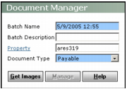 1 From the side menu, select Document Manager > Create Image Batch. The Document Manager filter appears.Batch Name Accept the default or type a new name.Batch Description Type a description.Property Type or select the code for the property to which you want to assign the image batch. Voyager uploads images to the corresponding property folder in the Reports Temp Path specified in the Accounts & Options screen.Document Type Select the type of record the documents in the batch are associated with.