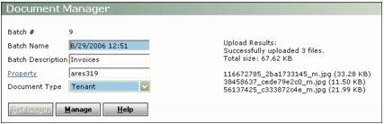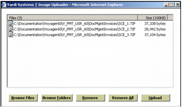 5 Click Upload. Voyager copies the files to a temporary folder and displays a status bar showing the progress of the upload. Upon completion, the Document Manager screen appears, displaying the results of the upload and the batch control number.