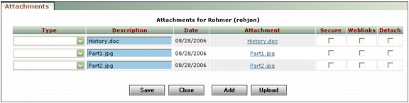 9 Select a type from the Type field for each attachment. Types are used to classify attachments.Types are set up by the system administrator. For more information, see “Attachments Security and Type Lists” in the Voyager Core Installation and Administration Guide.