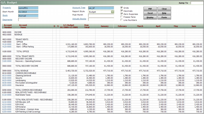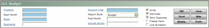 You can view G/L budget data in three styles, each described below. The examples show only portions of the reports because you have to scroll down, to the right, or both to view entire reports.