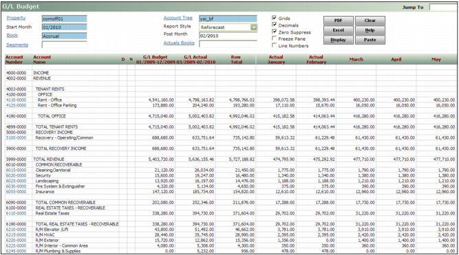 Reforecast Displays actual amounts for the post month and preceding months, and budgeted amounts for the remainder of the year. For example, if the start month is January and the post month is February, the report shows actual amounts for January and February, and budgeted amounts for March through December.