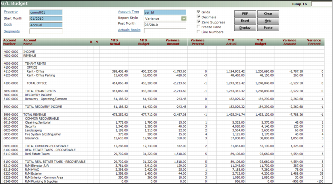 Variance Displays the actual and budgeted amounts, for both month-to-date (for the post month) and year-to-date (for the start month through the post month), with variance in both monetary amounts and percentages. For example, if the start month is January and the post month is March, the report displays the month-to-date actuals for March and the year-to-date for the year starting in January and ending in March.