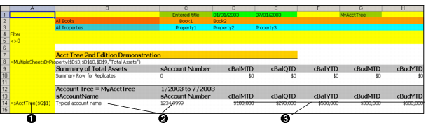 1 The sAcctTree function is placed in Column A, and, when the YSL report is generated, expands vertically to display accounts based on the selected account tree.