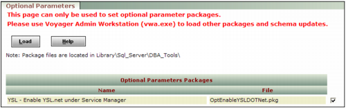 2 In the Optional Parameters Packages table, locate and select the check box next to the optional package named YSL - Enable YSL.net under Service Manager, with the file name OptEnableYslDotNet.pkg.
