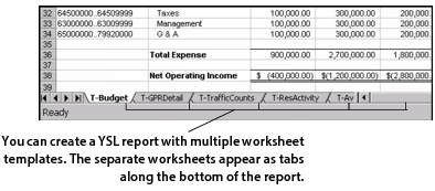 You can create a YSL report with multiple worksheet templates. To create a multiple worksheet YSL report, each worksheet of the report must have a unique name, prefixed by the letter T- or t- (case insensitive). For example, to name a worksheet Budget as part of a multiple worksheet YSL report, save the template as T-Budget.