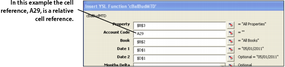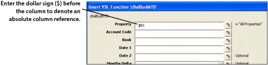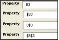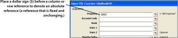 Entering Absolute and Relative Cell References The data you enter into Right-Click Function Builder field can be a literal value or a cell reference. When entering a cell reference, it is important to understand the difference between an absolute cell reference and a relative cell reference. Entering an absolute cell reference Absolute cell references are fixed and unchanging, regardless of how you copy or move the cell contents. When entering data into a Right-Click Function Builder field, you denote an absolute cell reference by placing a dollar sign ($) immediately before the reference as shown in the following graphic. In this example, $B$3 is entered into the Property parameter field, meaning that Column B and Row 3 (the cell reference) never change (they are absolute), regardless of how the data changes. Entering a relative cell reference A relative cell reference might or might not change, depending on the type of data or value that you want to appear. You denote a relative cell reference by NOT placing a dollar sign ($) before the reference. An example of a completely relative cell reference is A29. If you enter A29 as a reference, it means that the value of the column, A, and that of the row, 29, may or may not change, depending on the data and what type of value you want to appear on your YSL report. Entering a mixed cell reference A mixed cell reference is both absolute and relative. In the following example, the cell reference, $B3, is a mixed reference. Entering $B3 means that reference Column B never changes (it is absolute), but reference Row 3 may or may not change (it is relative). Cell Reference Summary Table Absolute vs. Relative Cell References Example: Denotes: $C$3 C is absolute; 3 is absolute. $C3 C is absolute; B is relative. C$3 C is relative; B is absolute. C3 C is relative; B is relative. You can toggle (switch) between absolute ($) and relative cell references (as shown in the following graphic) by repeatedly pressing F4 on your keyboard.