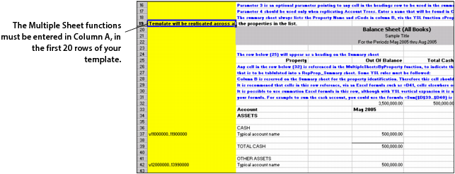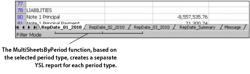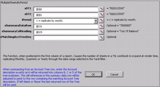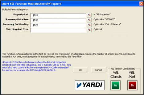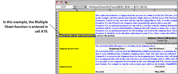In the following example, we have created a YSL balance sheet report template, YSL_Replicate_Property_Balance_Sheet.xls, where the MultipleSheetsByProperty function is entered in cell A19.If you want to review the function's parameter settings, right-click cell A19 and select This YSL Function. A screen similar to the following graphic appears.In the following example, we have created a YSL balance sheet report template, YSL_Replicate_Date_Balance_Sheet.xls, where the MultipleSheetsByPeriod function is entered in cell A19: