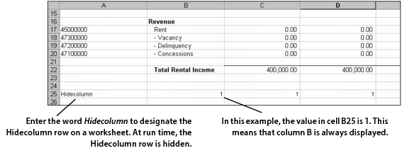 3 Enter the word Hidecolumn (with no space between the two words and no quotation marks) in any Column A cell of the worksheet (typically the final row of your template).