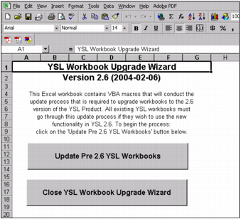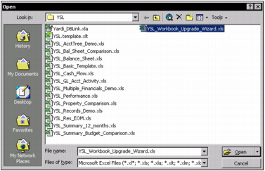 If you have YSL reports that were created with versions of YSL earlier than 2.6, use the Workbook Upgrade Wizard to upgrade these older reports. Your older YSL reports continue to work even if you do not update them, but upgrading older files gives them the expanded capabilities of the standardized YSL Classic.The Workbook Upgrade Wizard selects and upgrades older YSL reports based on a prefix that you enter. For example, all the YSL sample reports begin with the prefix “YSL” (such as YSL_BalanceSheet.xls). If you type YSL in the prefix field, the Workbook Upgrade Wizard locates and upgrades all the YSL reports whose file names begin with “YSL”.